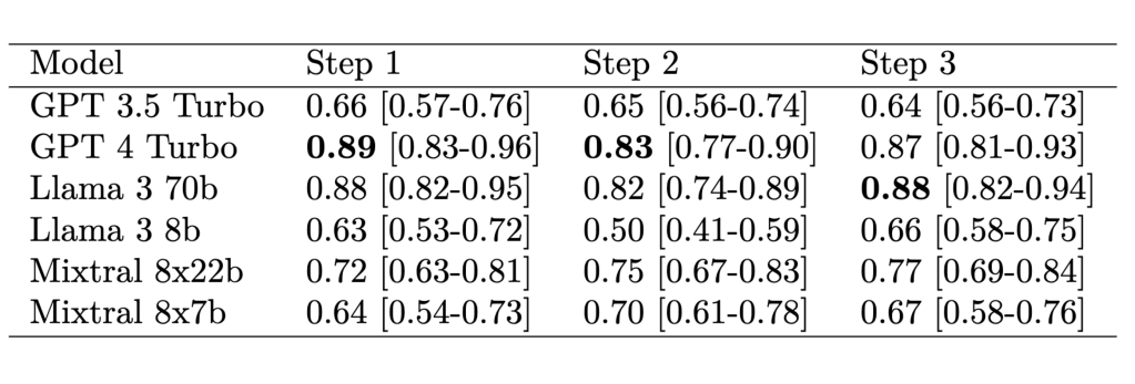 Given the semi-structured form of the model response, answer options could be extracted using regex and compared to the correct option to calculate accuracy for each step. Bootstrapping with 1000 iterations was used to calculate the 95% CI for the accuracy estimates.
