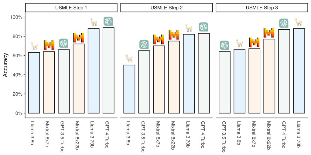 The competitive performance of the open-source model Llama3-70B against the state-of-the-art commercial model GPT-4-Turbo on the USMLE questions demonstrates the potential of open-source models to tackle complex, domain-specific tasks in the medical field. Of particular note is Llama3-70B’s superiority on Step 3, albeit by a narrow margin. This is the first time an open-source language model has performed on par with the leading proprietary commercial models, democratizing access to AI technology and making it more accessible to researchers and developers who may not have the resources to develop their own models. Powerful open source models facilitate the development of cost-effective, privacy-preserving, and customizable AI solutions for healthcare by providing greater transparency and control over the model’s architecture, training data, and behavior (Schur et al., 2023).